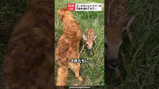 子鹿を連れてきたゴールデンレトリーバー