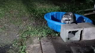 アライグマの「小さなお母さん」と赤ちゃんがピーカンナッツを食べ、水を飲む 2025/8/1 アライグマ Raccoon " Little Mama" & One Baby Eats Pecans & Drinks some Water 両方のアライグマはピーカンナッツを食べて、水を飲みました。