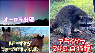 アライグマ24匹目捕獲・オーロラ出現・姉妹と交代でトルーマン達が来ました 2025/11/20 アライグマ アライグマ24匹目捕獲・オーロラ出現・姉妹と交代でトルーマン達が来ました ルース・キティの交代要員としてジミー達と一緒にトルーマンがファームに初めてやってきました。ティンカーとは初対面です。
