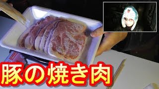 バター5gと油小さじ1でニンニク1片を熱し取り出し、常温に戻し塩胡椒した豚ロース肉一枚を焼き皿に盛る