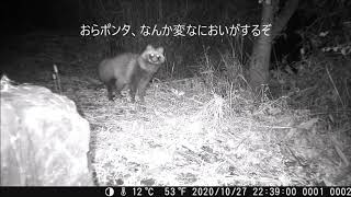 ウチのけものみちにアライグマが登場しました。先住民のタヌキがにおいを感じてとまっどているようです。