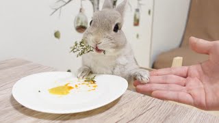 うさぎ🐰におやつあげる時喜んですっ飛んできて可愛いな😍って思うんだけど、おやつ持ち逃げされて、隅っこで食べてるの。