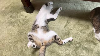 座ってるセミの膝の上で寛いでるし寝っ転がってるセミのお腹の上で寝てるフォス、ほぼネコチャン