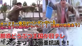 謝罪文は、池に落ちるのは予定通り、でも落ちた池が違った、と読める。これについての評論家佐藤栄記氏の以下コメはド正論と思う。「芸人の暴走ではなく、演出だったのなら言語道断。各動物園が鳥インフル等で感染症対策に神経をとがらせているなか、ペンギン舎の池に未消毒の服ごと落ちるなど論外。」