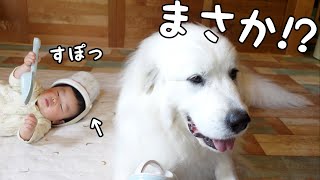 【え!?】後ろでとんでもないことになってる妹に気づいた超大型犬が面白いw|グレートピレニーズ