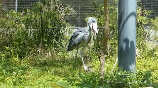 池のある広い方の放飼場にいるのがメスのハシビロコウ「カシシ」で、狭い方にいるのがオスの「ささ」です。 「ささ」はカシシ …