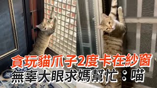 貪玩貓爪子2度卡紗窗 睜無辜大眼狂喵求媽幫忙|寵物動物|貓|萌寵|精選影片