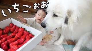 【歓喜】妹と超大型犬が大好きないちごを大量に買ってあげたら大変なことにw|グレートピレニーズ