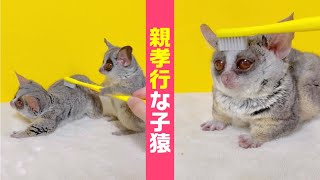父猿にブラッシングをする親孝行な小猿がカワイイ Baby monkey helping with brushing