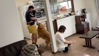 赤ちゃんと大型犬の久しぶりの再会。