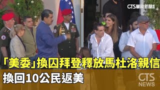 「美委」換囚 拜登釋放馬杜洛親信換回10公民返美|華視新聞 20231221 2023/12/21 馬 「美委」換囚 拜登釋放馬杜洛親信換回10公民返美|華視新聞 20231221 由卡達居中促成,美國與委內瑞拉政府達成換囚協議。委內瑞拉把捲入美軍貪腐案的前包商「胖子雷納德」引渡到美國。美國則是 …