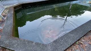 角池の鯉 鳥の羽浮いたある
