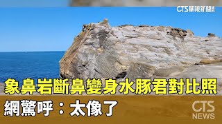 象鼻岩斷鼻變身水豚君對比照曝 網驚呼:太像了|華視新聞 20240116 2024/1/17 豚 象鼻岩斷鼻變身水豚君對比照曝 網驚呼:太像了|華視新聞 20240116 位在新北瑞芳區的象鼻岩,其中象鼻去年12月16日掉入海中,前(14)日有民眾在臉書社團發出照片,巧妙的發現從某個角度看上去, …