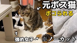 ストーブで温まりたくて真ん中に割り込んだ結果大ピンチな元ボス猫