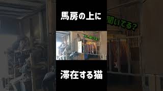 馬房の上に堂々といる小さな猫と大きくて優しい馬。