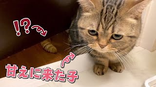 お風呂あがりのママに甘えに来た弟猫の背後に忍び寄る影が…!? 2024/2/22 ネコ お風呂あがりのママに甘えに来た弟猫の背後に忍び寄る影が…!? 短足マンチカンの男の子、プリンとメルです! いつものようにメルが甘えに来た!と思ったらメルとは違う色のしっぽが…