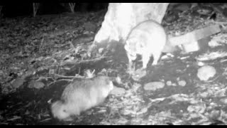 罠に掛かったアライグマとタヌキの睨み合い 2024/3/4 アライグマ 罠に掛かったアライグマとタヌキの睨み合い 柿の木の下でアライグマとタヌキが鉢合わせになり、睨み合いながら罠の餌を取り合うがアライグマが餌を独占する、罠が作動し …