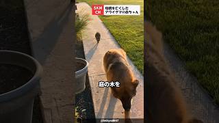 犬に付いて行くアライグマの赤ちゃん